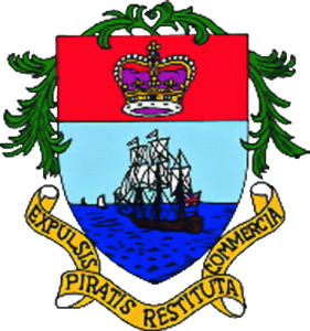 The Coat of Arms displayed was granted in 1728. It consists of a crown on a red background, surmounting a naval scene alluding to the extirpation of piracy by Governor Roger Woodes in 1718. The motto is Expulsis Piratis Restitua Comercia (When the pirates were expelled, trade flourished).