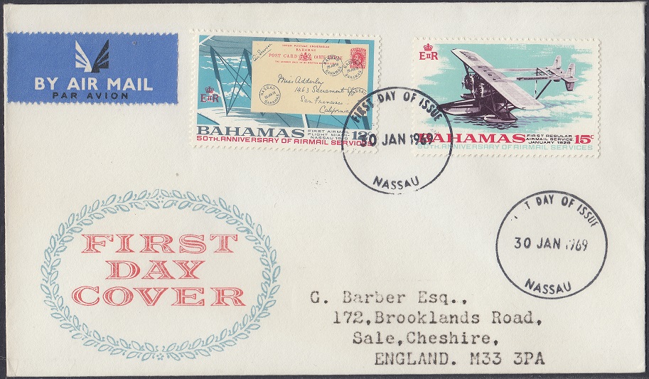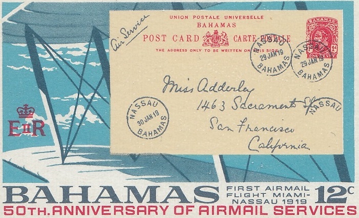 In 1969, Bahamas celebrated the 50th Anniversary of the first airmail flight from Nassau to Miami in 1919 and the First Regular Airmail Service in January 1929.