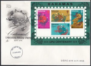 The stamps depict the UPU Monument (Weltpostdenkmal) in Bern. It was created by René de Saint-Marceaux (1909) and is of bronze and granite and represents the five continents joined to transmit messages around the globe. It was adopted as the organization’s logo in 1967.