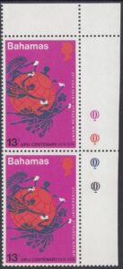 Bahamas Bahamas Philately: 1974 Universal Postal Union Centenary (1874-1974) – 13c UPU Monument thedigitalphilatelist 23/04/1974 Details Designer: P Powell Printer: Questa Colour Security Printers Limited (The House of Questa) Process: Lithography Paper: Watermark: Multiple St Edward’s Crown Block CA (sideways) Perf: 14 (comb) Cylinders: Sheet: Quantity: