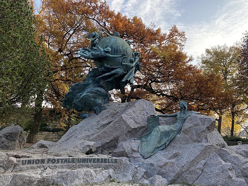 The stamps depict the UPU Monument (Weltpostdenkmal) in Bern. It was created by René de Saint-Marceaux (1909) and is of bronze and granite and represents the five continents joined to transmit messages around the globe. It was adopted as the organization’s logo in 1967.