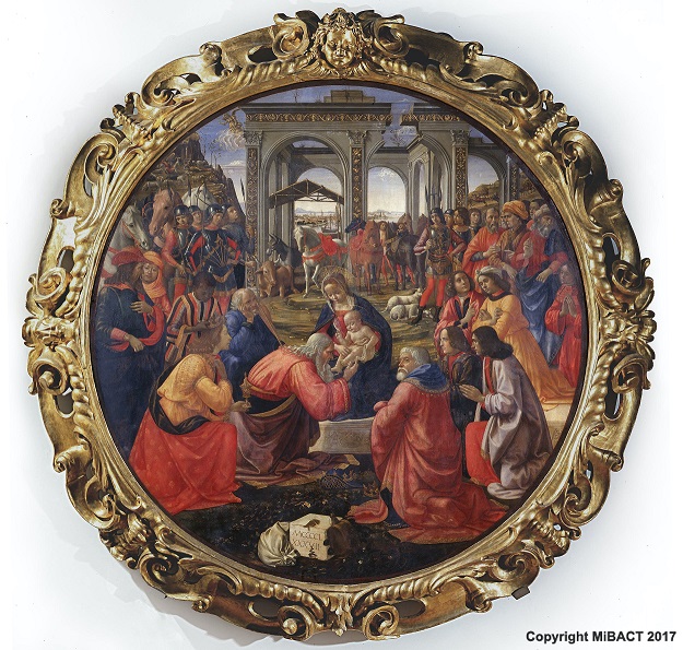 The homage of the Magi to the newly born Saviour is set against a backdrop dominated by the ruins of an ancient building, with the stable where Jesus was born in the middle. The decorative friezes on the portico are inspired by ancient Roman art, which Domenico Ghirlandaio was able to admire on his travels to Rome where, among other things, he worked on the decorations of the Sistine Chapel in St Peter’s Basilica.