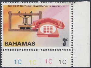 The 3c stamp depicts Bell’s first telephone and a modern telephone.