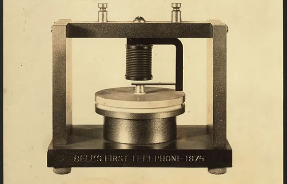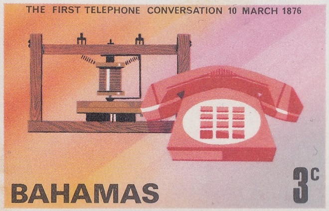 The 3c stamp depicts Bell’s first telephone and a modern telephone.