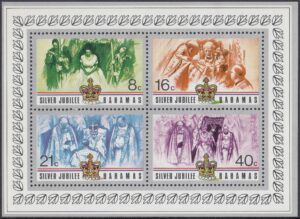 Bahamas Bahamas Philately: 1977 H.M. Queen Elizabeth II Silver Jubilee – 85c Miniature Sheet thedigitalphilatelist 07/02/1977 Details Designer: Gyula László Vasarhelyi Printer: Impression Cartor S.A. 61300 L’Aigle France Process: Lithography Paper: Watermark: Multiple Crown CA Diagonal (sideways) Perf: 12 (comb) Cylinders: Sheet: Quantity: