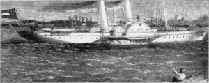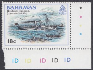The stamp depicts an engraving featuring a Confederate blockade runner entering the port laden with cotton after successfully slipping through the blockade. The runner appears to be the Ruby, a 177′ iron hull sidewheel steamer which made 8 successful blockade runs before being destroyed on 11 June 1863 near Charleston.