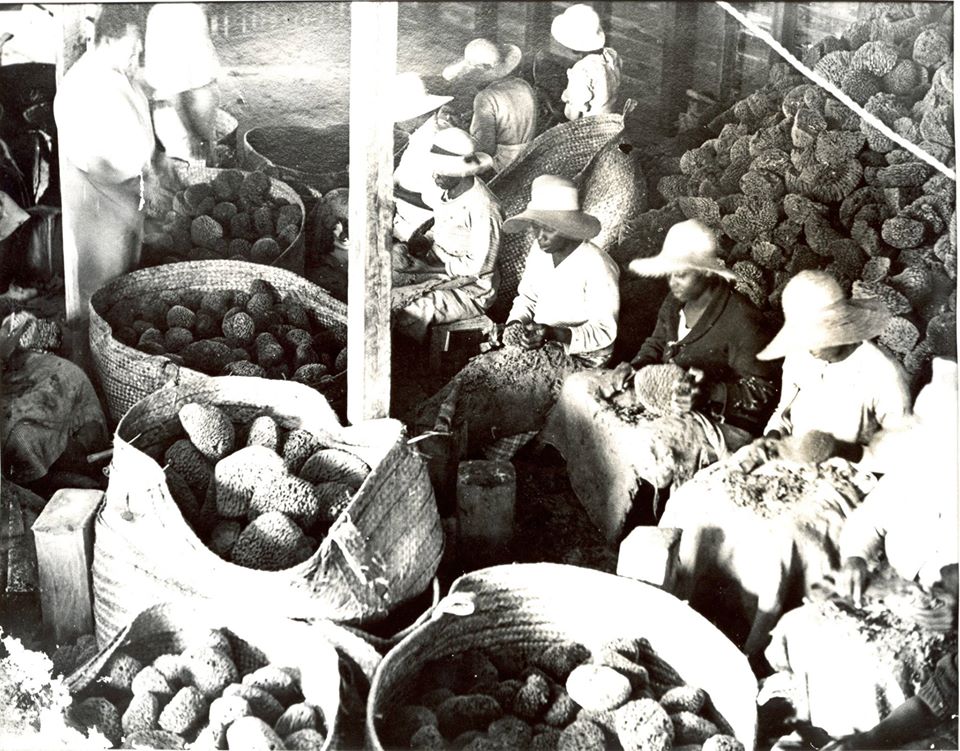 Women usually sat on boxes clipping the sponge using sheep-shearing shears. The roots were cut-off, and the sponges trimmed, retaining the symmetry of the sponge as much as possible. Once trimmed, and the pieces of rock removed, the sponges were thrown into large native straw baskets. A full basket was removed and handed over to “sorters” who trimmed the sponge further if necessary, and examined them for elasticity and texture. During the clipping the women often smoked their clay pipes and sang spirituals and other religious hymns.