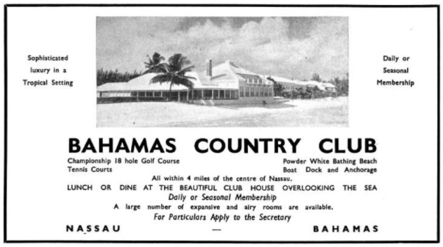 In 1935, Sir Harry Oakes, one of the richest baronets in the British Empire, moved to the Bahamas for tax reasons and soon proved to be a dynamic investor, entrepreneur and developer in the Bahamas. The Bahamas Country Club was on grounds owned by Sir Harry Oakes and his favoured place of residence, Westbourne. He set about to rebuild the club and it became one of the showpieces of the island, boasting an 18 hole golf course, tennis, a boat dock and anchorage, and water-skiing on the beach.