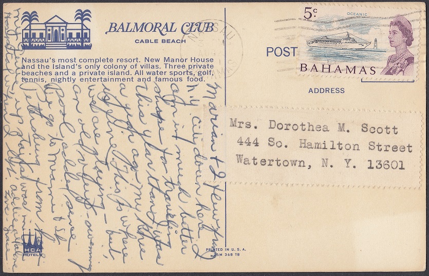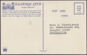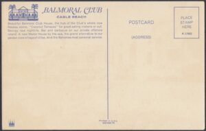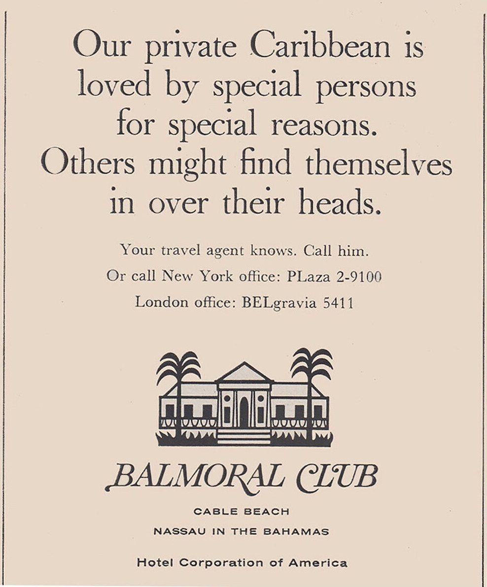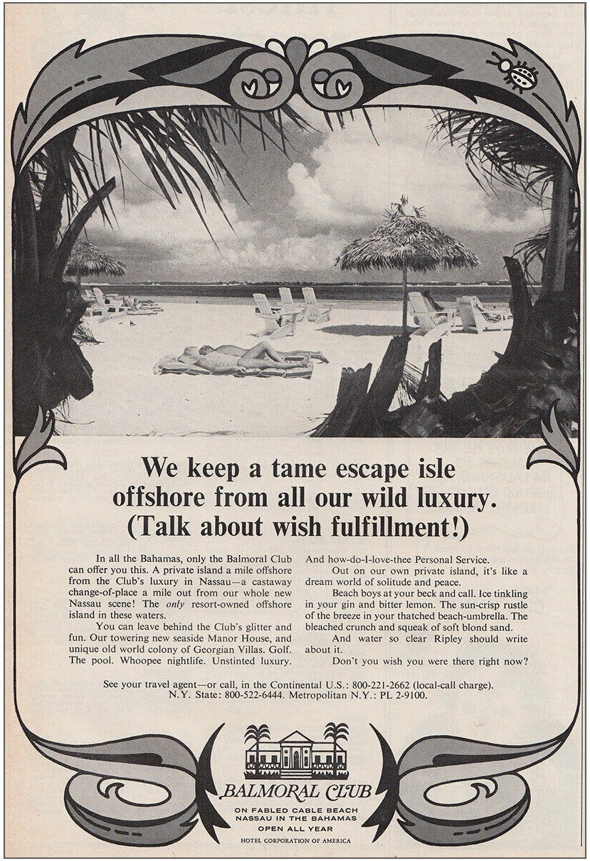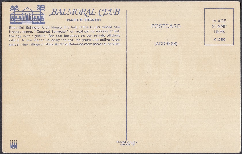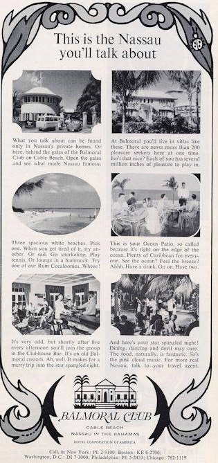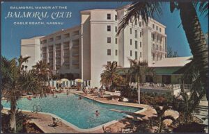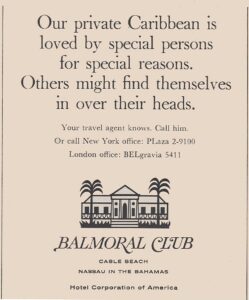 In 1963, the Balmoral Club fell under the ownership of Hotels Corporate of America (HCA). By now, the Balmoral Club offered “coconut terraces” for indoor and outdoor dining with “swinging nightlife.” The resort also owned Balmoral Island – the only resort-owned island in the Bahamas – where it offered a bar and barbeque.