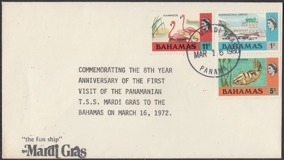 Commemorating the 8th year anniversary of the first visit of the Panamanian T.S.S. Mardi Gras to the Bahamas on March 16, 1972.