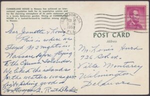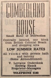 Cumberland House was a small guest house based one block from the British Colonial Hotel and shopping area. The guest house provided 25 rooms for accommodation – all were air conditioned with a private bath and balcony. It was run by two restauranters, Lorraine Onderdonk (Secretary of Bahamas Hotel Association Ltd) and Hedwig Hauck.