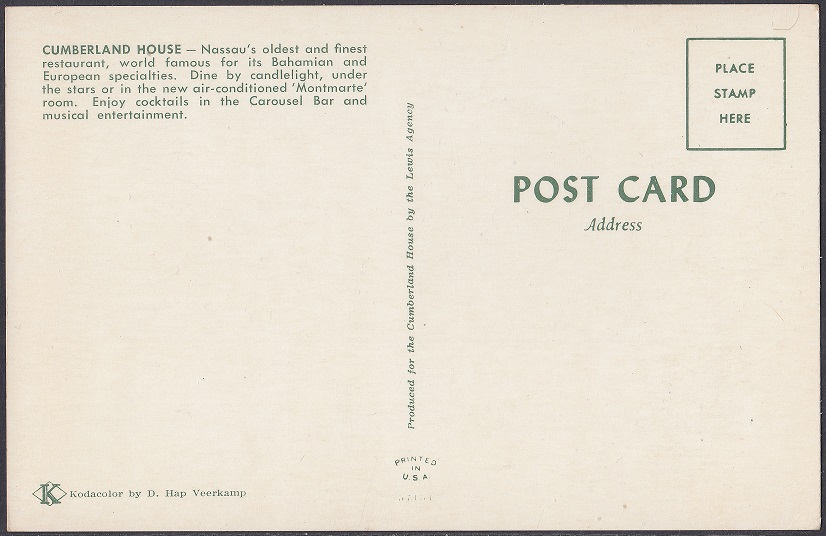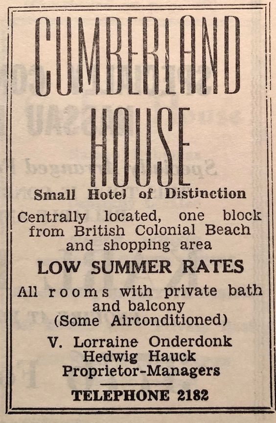 Cumberland House was a small guest house based one block from the British Colonial Hotel and shopping area. The guest house provided 25 rooms for accommodation – all were air conditioned with a private bath and balcony. It was run by two restauranters, Lorraine Onderdonk (Secretary of Bahamas Hotel Association Ltd) and Hedwig Hauck.