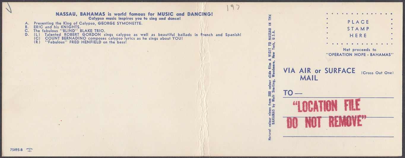 | 75495-B | Nassau Bahamas is world famous for Music and Dancing! - George Symonette - Eric and his Knights - "Blind" Blake Trio - Robert Gordon, Count Bernadino, Fred Henfield |