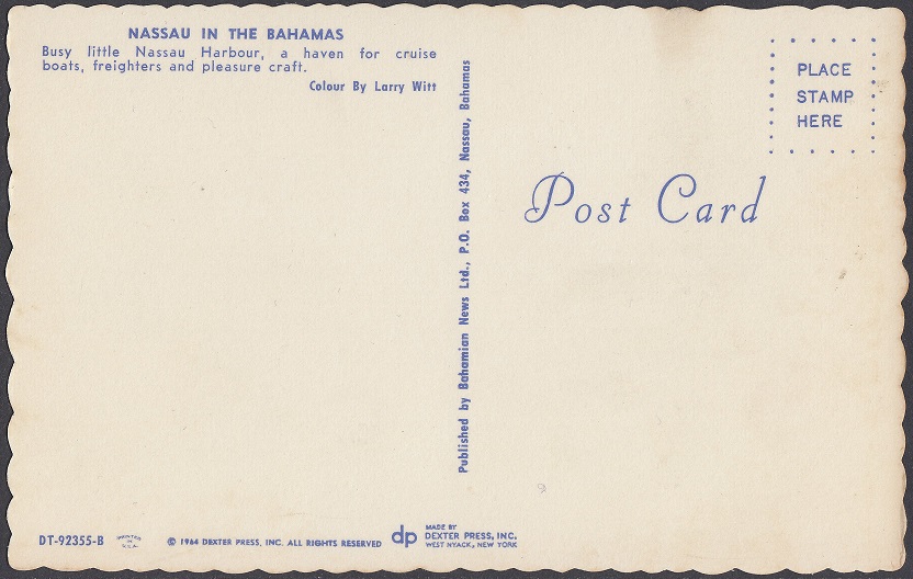 Type A is published by Bahamian News Ltd. It is a smaller sized card measuring 14cm x 9cm. The imprint reads Printed in USA ©1964 Dexter Press Inc, All Rights Reserved and the backing is blue.