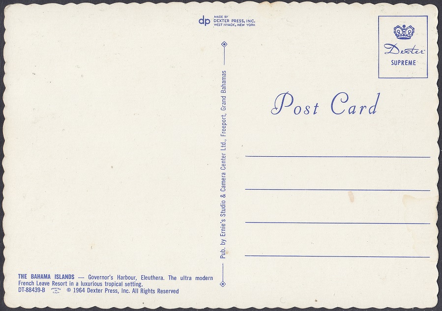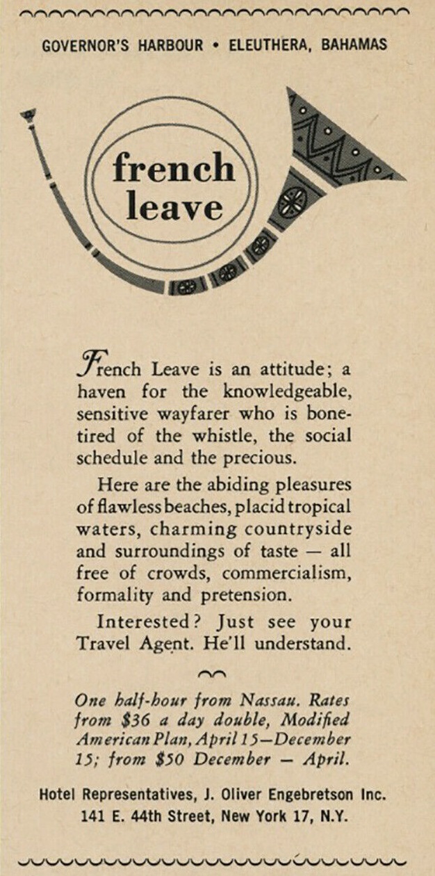 The French Leave hotel was located in Governor’s Harbour, Eleuthera. It was considered one of the oldest inns in the Out Islands. The hotel was a cottage-style resort located on a mile and a half pink sand beach