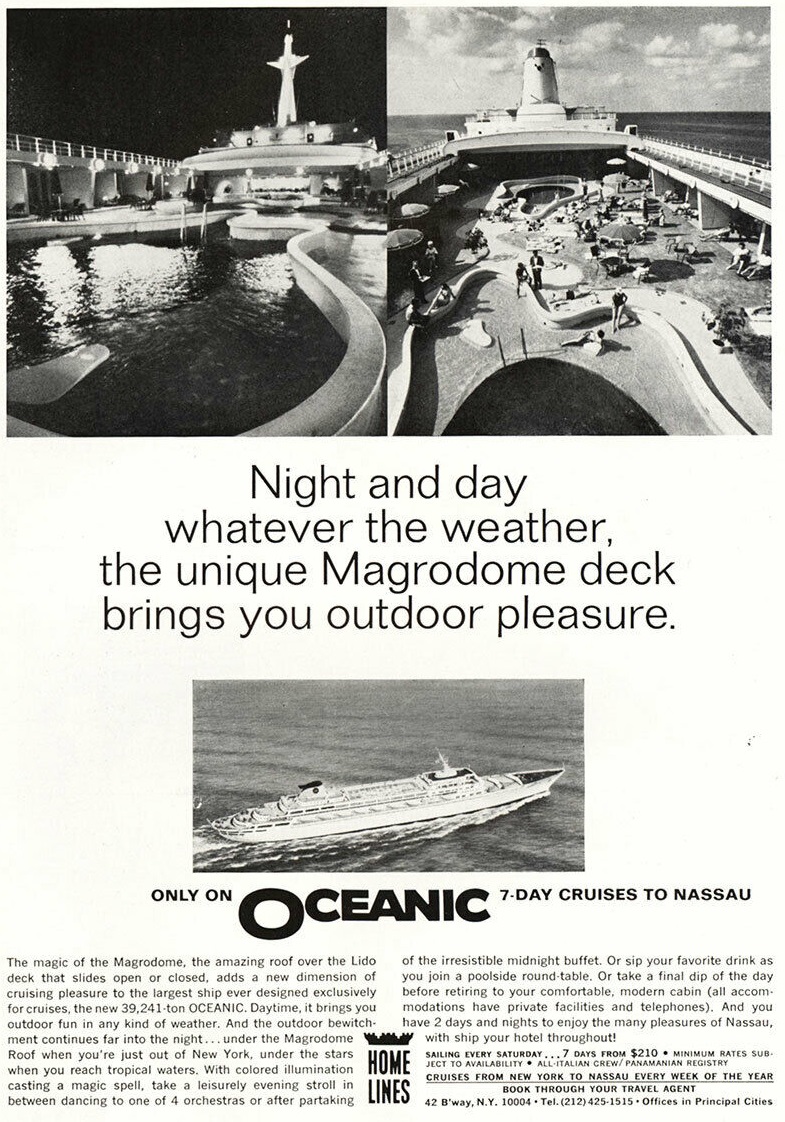 S/S Oceanic was built in 1963 by Cantieri Riuniti dell’ Adriatico, Monfalcone, Italy for Home Lines. She was delivered to Home Lines in March 1965. She made a short series of transatlantic crossings, following which she entered cruise service from New York to the Bahamas on 24 April 1965, operating in tandem with the company’s older SS Homeric.