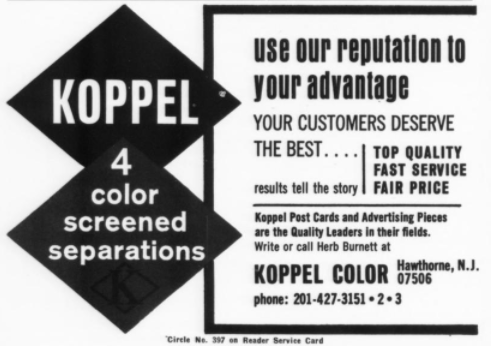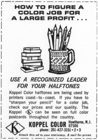 In the late 1950’s, the company promoted their colour offset process. By the mid-1960’s Koppel was one of the largest postcard publishers in America, along with Dexter Press.