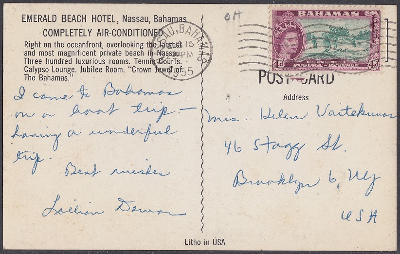 Bahamas Bahamas Philately: Litho in USA (Emerald Beach Hotel) thedigitalphilatelist 01/01/1955 Details Publisher: Litho in USA Printer: Litho Arts Inc., Miami, Florida Year: c.1955 Series: No.DescriptionDate N/AEmerald Beach Hotel, Nassau, The Bahamas15/08/1955