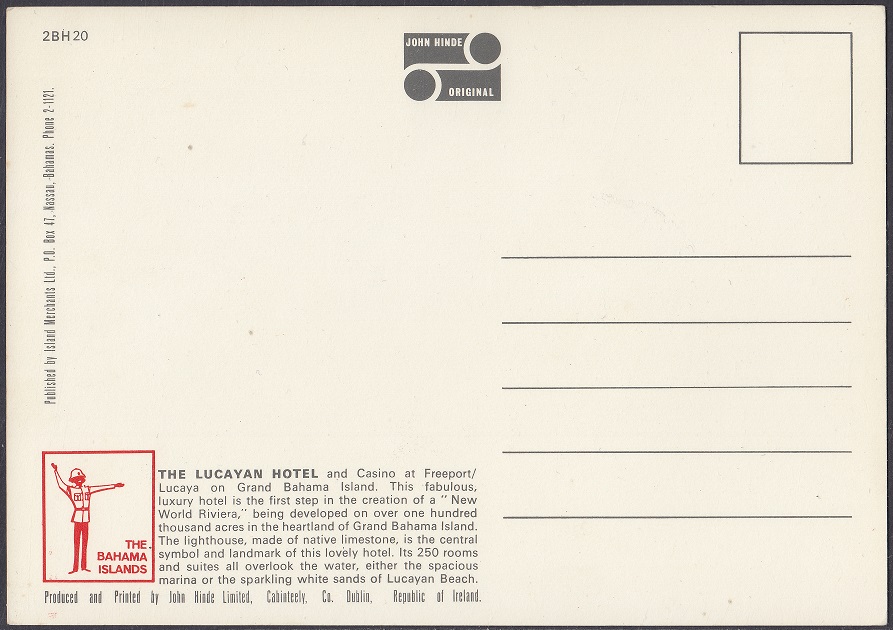The Lucayan Hotel and Casino was opened in December 1963. The 263 room hotel was built at a cost $8.6m by Canadian Louis Chesler (president of Grand Bahama Development Ltd) with the assistance of Dino Cellini, an associate of gambling magnate, Meyer Lansky (a mob gangster).