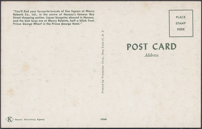 Maury Roberts Co., Ltd was originally owned by J Maury (and later by his sons Marcel and Peter Maury) and J W Roberts . It was located on the ground floor of the Prince George Hotel on Bay Street in Nassau. The Maury’s were part owners of the hotel with Roberts being a past owner.