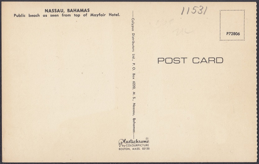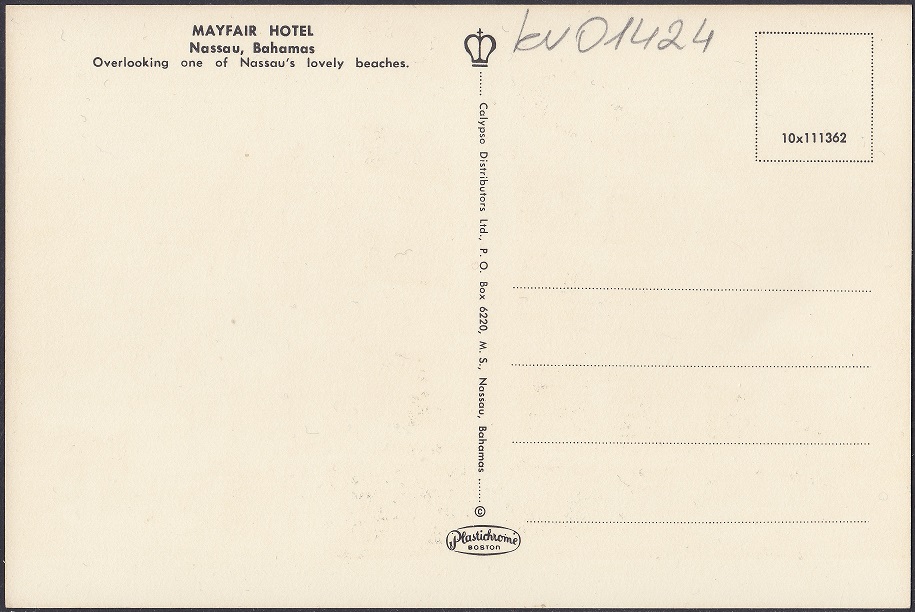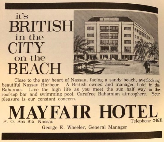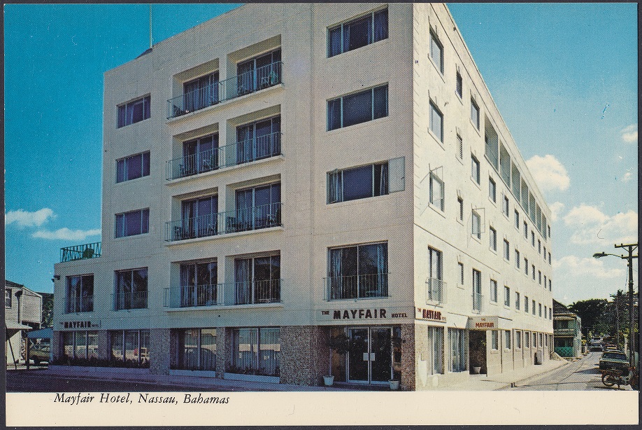 The Mayfair Hotel began construction in 1957 and opened early 1959. The 56 room hotel was built by Ernest Batley and operated by the Clifford Hotels Ltd. It overlooked Nassau Harbour and had a roof-top bar and swimming pool.