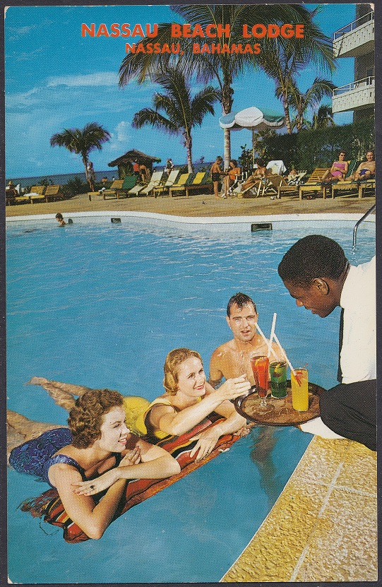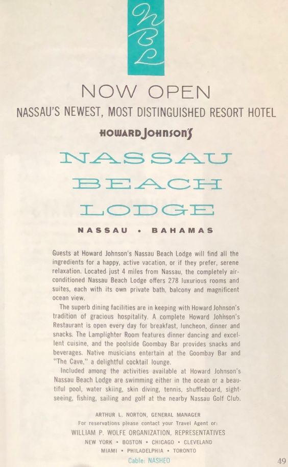 Howard Johnson’s Nassau Beach Lodge opened 25 January 1958 (although also cited as 4 February 1958). It contained 278 rooms and 22 suites, each with a “bath, air-conditioner, and private balcony with sea views.” Its speciality rooms included the Cave Lounge, the Lamplighter Room, the Howard Johnson Restaurant and a poolside bar called Goombay Bar offering delights such as “snacks, beverages and authentic island music by native artists.”