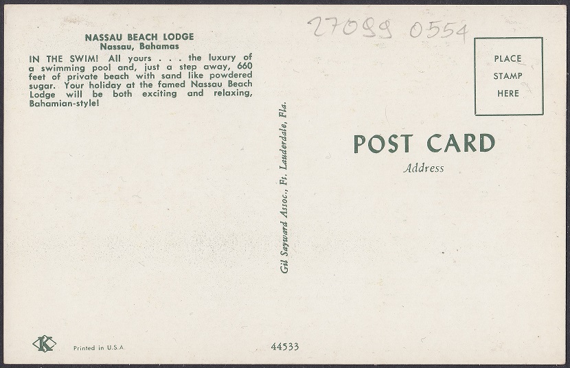 In 1957, it was announced that the new Nassau Beach Lodge was to be operated by George W Gill Jr, a wealthy Fort Lauderdale construction company. The hotel was originally named ‘The Nassau‘ and was advertised as Nassau’s newest air conditioned hotel, on the beach, with nightly entertainment. However, it appears the company abandoned plans to operate the hotel, and instead bought and operated the British Colonial Hotel, announcing in 1958 major renovations to the British Colonial.