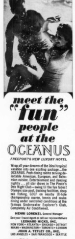 The Oceanus Hotel, Freeport, was opened in December 1965. It was originally named the Oceanus Inn but the name was changed just before it opened. The hotel hosted 168 rooms divided into 10 three-bedroom suites, 30 two-bedroom suites and 60 one-bedroom units.