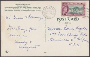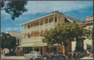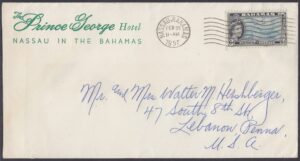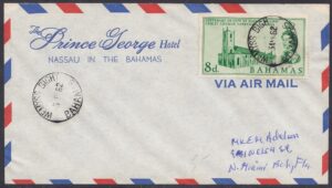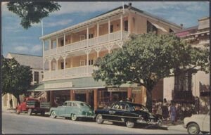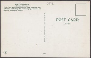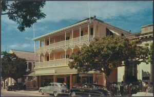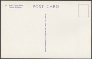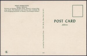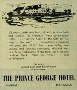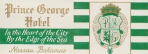 The Prince George Hotel was constructed between 1935-36 on Bay Street, Nassau, by Roland Symonette and was designed by Albert J Lothian. The hotel was known for its Harbour Deck Restaurant and the Maury Roberts Co. Ltd shop.
