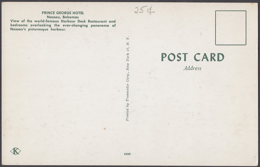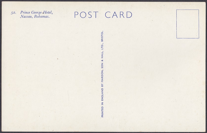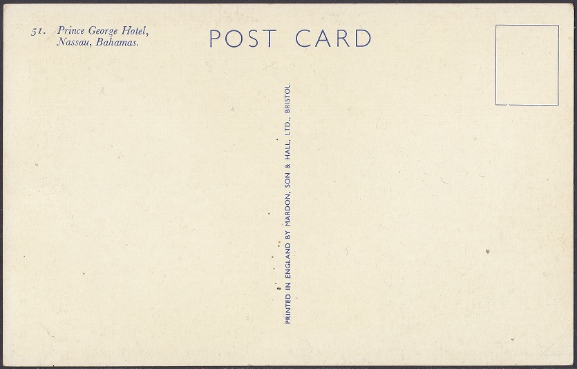 The Prince George Hotel was constructed between 1935-36 on Bay Street, Nassau, by Roland Symonette and was designed by Albert J Lothian. The hotel was known for its Harbour Deck Restaurant and the Maury Roberts Co. Ltd shop.