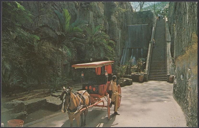 In the early 1970s, a waterfall was constructed next to the staircase, cascading to a pool below. At the bottom a walkway goes between high stone walls, tropical plants and trees.