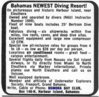 Romora Bay Club was located on Harbour Island, south of Dunmore Town. The club was owned and managed by Roy and Moyra Schmidt and opened between 1970-71. The Schmidts were divers and members of the Underwater Explorers Society in Freeport, Bahamas.