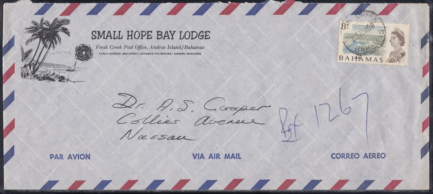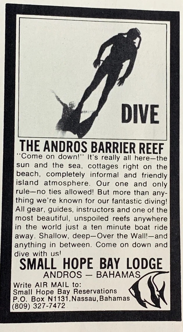 Small Hope Bay Lodge at Fresh Creek, Andros Island was opened in 1960. It was hand-built by Dick Birch with local materials of coral rock and pine.