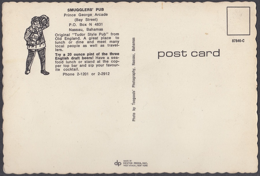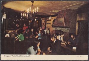 The Smuggler’s Pub was an old English, Tudor style pub located in the Prince George Arcade, Nassau. It was established c.1974. The pub provided seafood and traditional British lunches and dinners, as well as cocktails and beer.