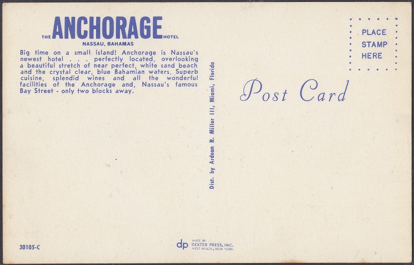 The Anchorage Hotel was located on West Bay Street, Nassau. The five storey, 114-room hotel began construction in 1966 and opened in 1967. It overlooked Nassau’s scenic Western Esplanade and beach.