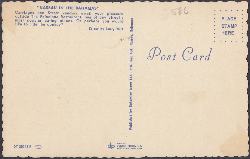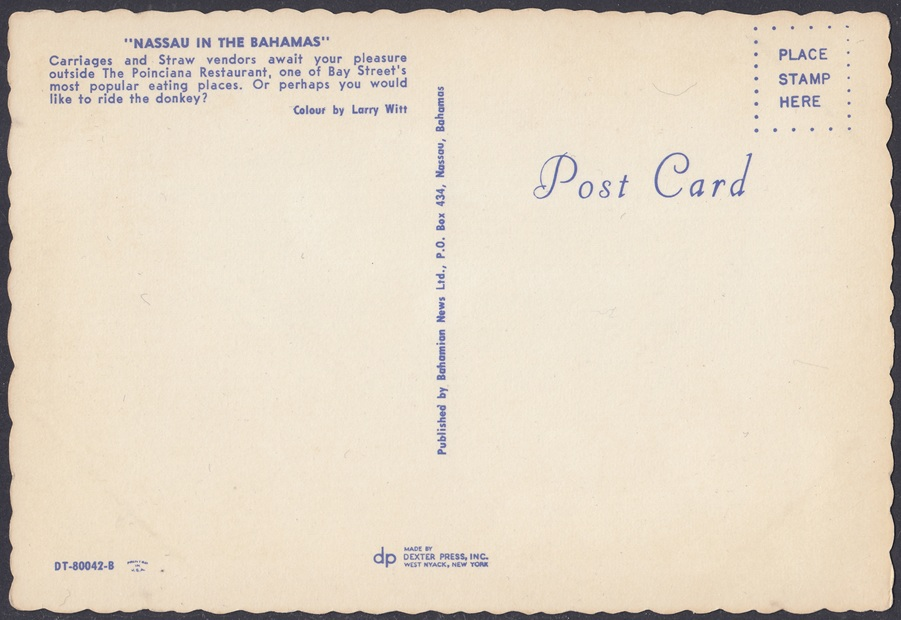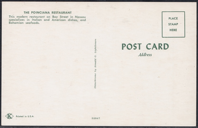 The Poinciana Restaurant was located on the corner of Bay Street and Frederick Street, Nassau. It specialised in Italian and American dishes, and Bahamian seafood.