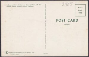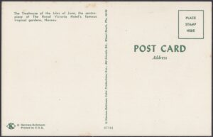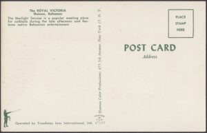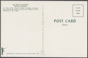 In 1958 the Royal Victoria Hotel was put up for sale and was purchased hotel by Treadway Inns International Ltd in 1959. The hotel was closed for a million dollar restoration and re-opened in December of that year. Upgrades included the new Queen’s Court accommodation, a new nightclub, the Treadmill Room Supper club, and complete air-conditioning was added throughout.