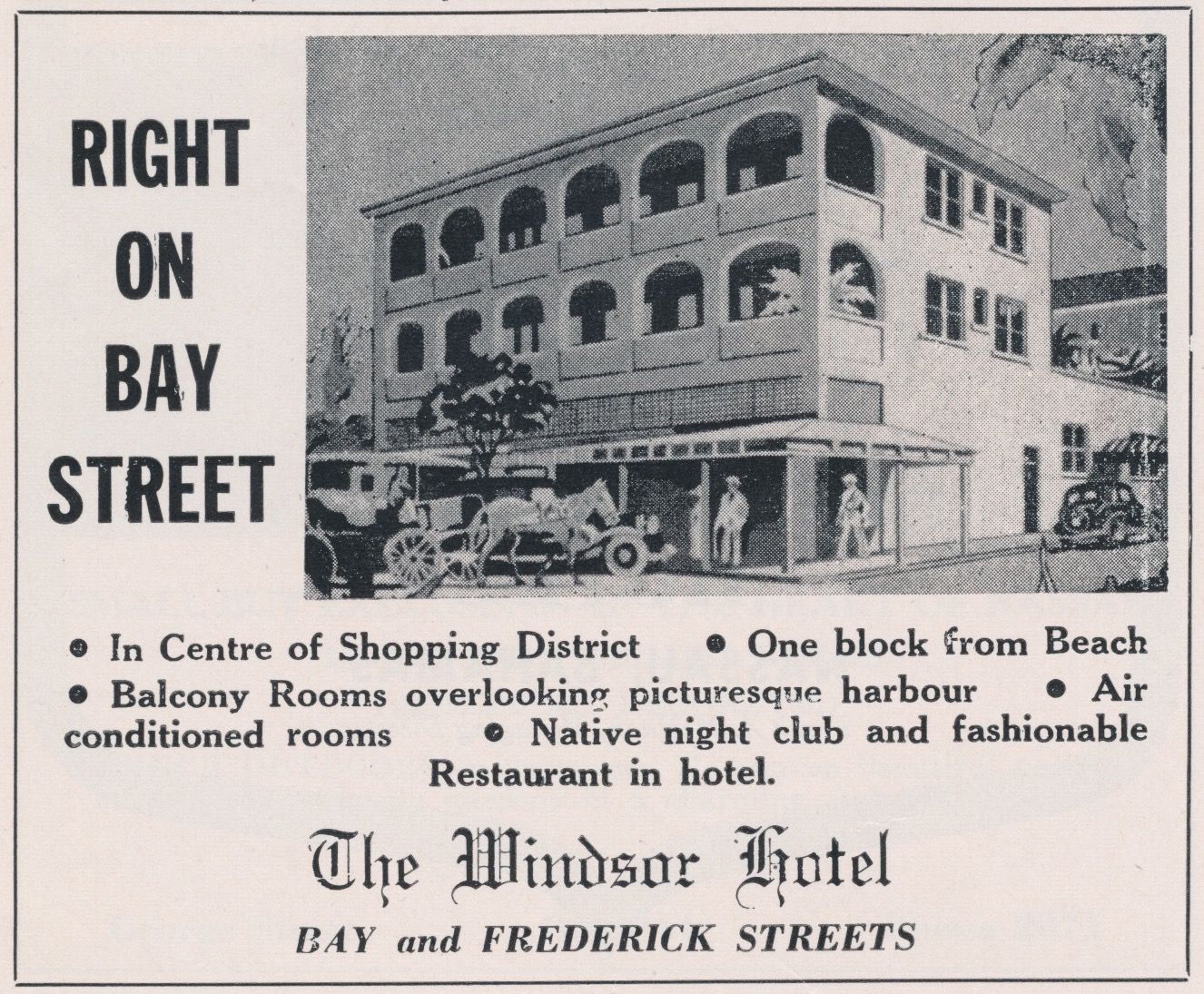 The Windsor Hotel was constructed A. Baker & Sons in the 1930’s and was the first hotel in the centre of Bay Street. The hotel opened for trade in 1938 prior to the outbreak of World War II but did not officially open until 1946, after the end of the war.