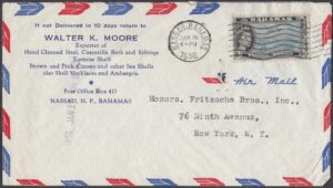 Sir Walter Kingsbury Moore (1883 – 1957) was a merchant and the largest exporter of Bahamian sisal hemp and marine products (tortoise and sea shells).He exported Cascarilla Bark, Siftlings, Brown and Pink Cameo and other seashells including shell necklaces and Ambergis.