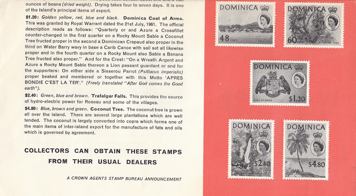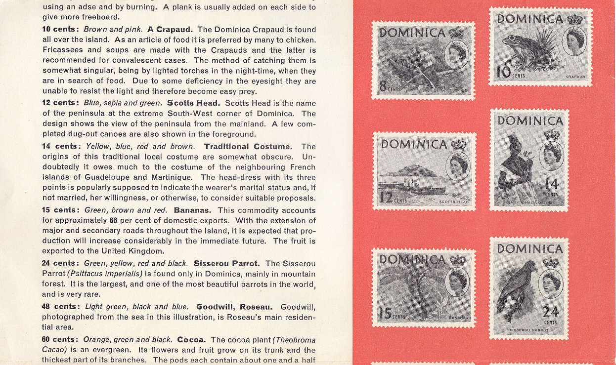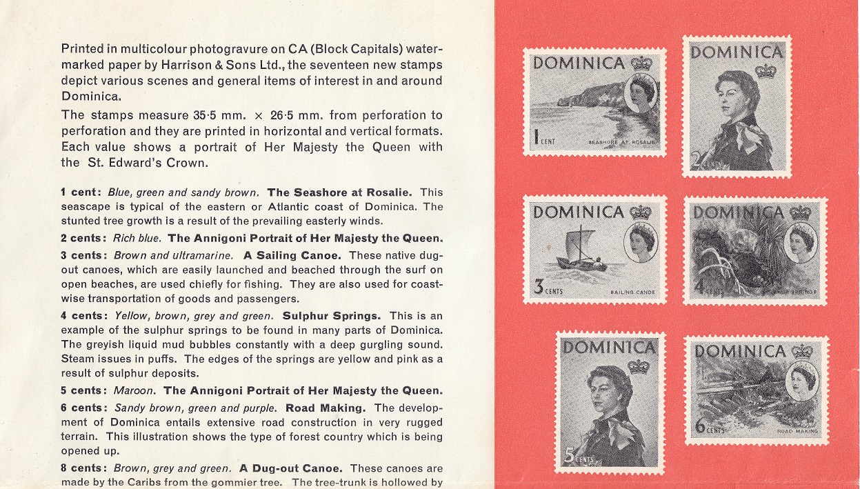 Printed in multicolour photogravure on CA (block capitals) watermarked paper by Harrison & Sons Ltd., the seventeen new stamps depict various scenes and general items of interest in and around Dominica.