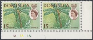 Dominica Dominica Philately: 1967 – 1963 Definitive Series (4th Reprint) – 15c Bananas thedigitalphilatelist 05/05/1967 Details Designer: S Scott Printer: Harrison & Sons Ltd. Process: Photogravure Paper: Watermark: St Edwards Crown C.A. Block (Sideways) Perf: 14.5 x 14 (comb) Cylinders: 1A (Brown), 1A (Yellow), 1A (Green) Sheet: R5 x 10 Quantity: Cylinder Numbers