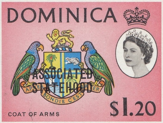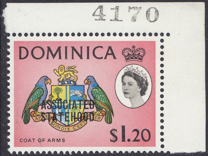 Dominica Dominica Philately: 1968 Associated Statehood – $1.20 Coat of Arms thedigitalphilatelist 08/07/1968 Details Designer: S Scott Printer: Harrison & Sons Ltd. Process: Photogravure Paper: Watermark: St Edwards Crown C.A. Block (Upright) Perf: 14.5 x 14 (comb) Gum: Arabic Cylinders: 1A 1A 1A 1A Sheet: R5 x 10 Quantity: Sheet Numbers