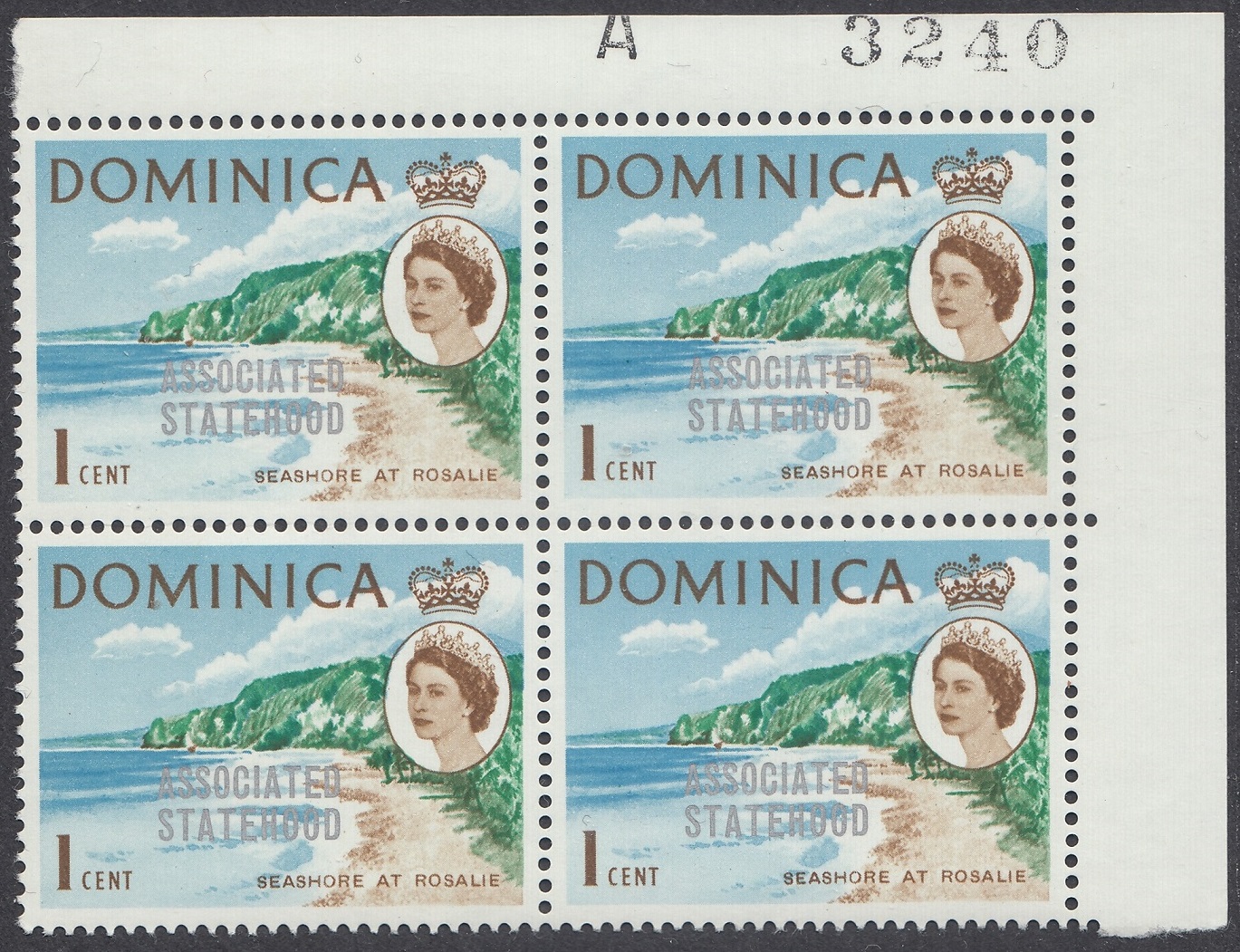 Dominica Dominica Philately: 1968 Associated Statehood – 1c Seashore at Rosalie thedigitalphilatelist 08/07/1968 Details Designer: S Scott Printer: Harrison & Sons Ltd. Process: Photogravure Paper: Watermark: St Edwards Crown C.A. Block (Sideways) Perf: 14.5 x 14 (comb) Gum: PVA Cylinders: 1A 1A 1A Sheet: R5 x 10 (horiz) Quantity: Sheet Numbers