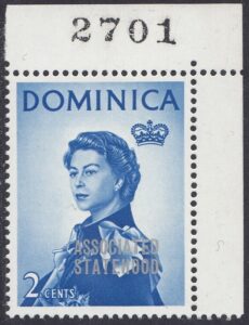 Dominica Dominica Philately: 1968 Associated Statehood – 2c Portrait of Queen Elizabeth II thedigitalphilatelist 08/07/1968 Details Designer: S Scott Printer: Harrison & Sons Ltd. Process: Photogravure Paper: Watermark: St Edwards Crown C.A. Block (Upright) Perf: 14 x 14.5 (comb) Gum: PVA Cylinders: 1A (Rich blue) Sheet: R10 x 5 (vert) Quantity: Sheet Numbers