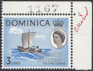 Dominica Dominica Philately: 1968 Associated Statehood – 3c Sailing Canoe thedigitalphilatelist 08/07/1968 Details Designer: S Scott Printer: Harrison & Sons Ltd. Process: Photogravure Paper: Watermark: St Edwards Crown C.A. Block (Upright) Perf: 14.5 x 14 (comb) Gum: PVA Cylinders: 1B 1B Sheet: R5 x 10 Quantity: Sheet Numbers