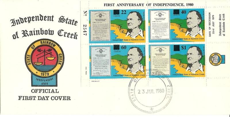 The Independent State of Rainbow Creek was an Australian secessionist micronation active during the 1970s and 80s, located in Cowwarr, a town on the Thomson River in the Victorian Alps. It was founded on 23 July 1979 by Thomas Barnes in protest of alleged incompetence by the Government of Victoria and others in regards to the flooding of his and others’ properties.
