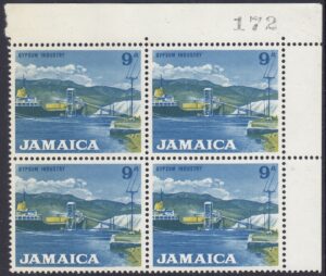 Jamaica Jamaica Philately: 1964 Definitive Series – 9d Gypsum Industry thedigitalphilatelist 04/05/1964 Details Designer: Victor Whitely Printer: Harrison & Sons Ltd. Process: Photogravure Paper: Watermark: Multiple J & Pineapple Perf: 14.5 x 14 (comb) Cylinders: Sheet: R6 x 10 (60 stamps) Quantity: Reprint: 27 June 1967 Sheet Numbers