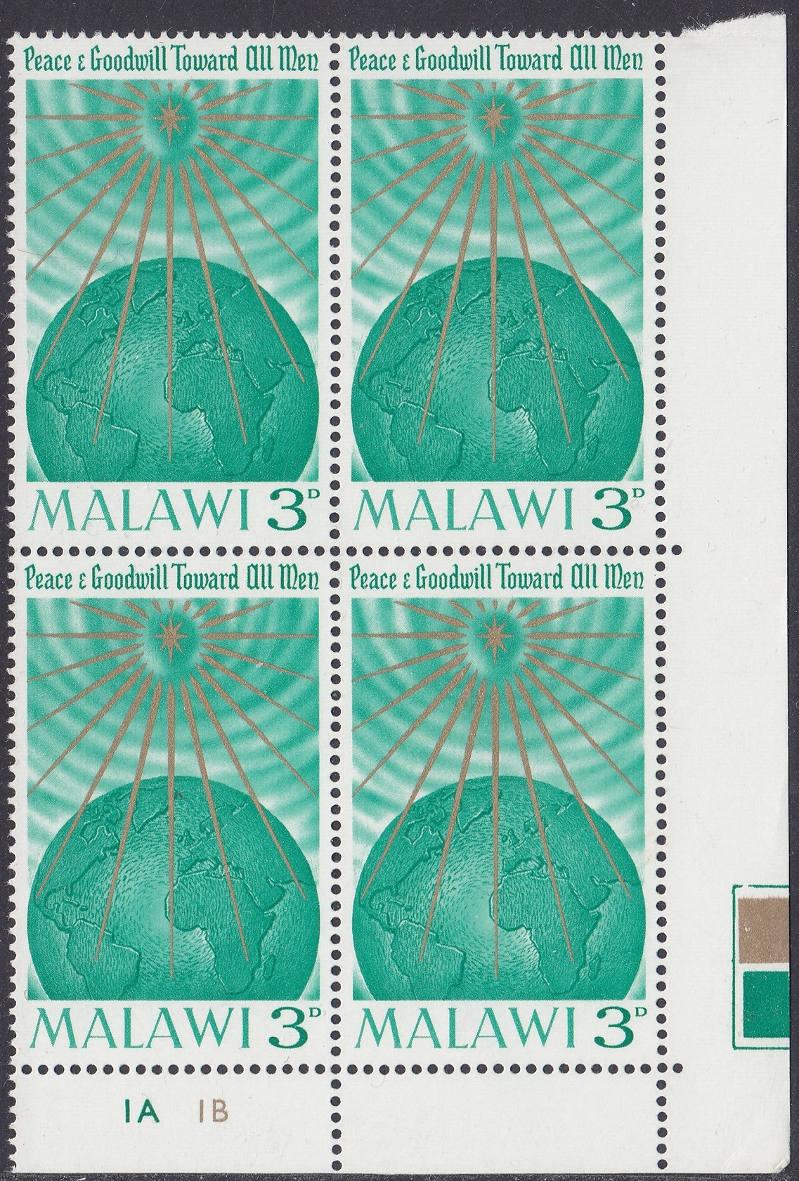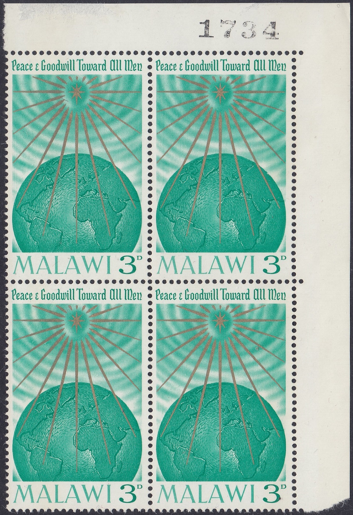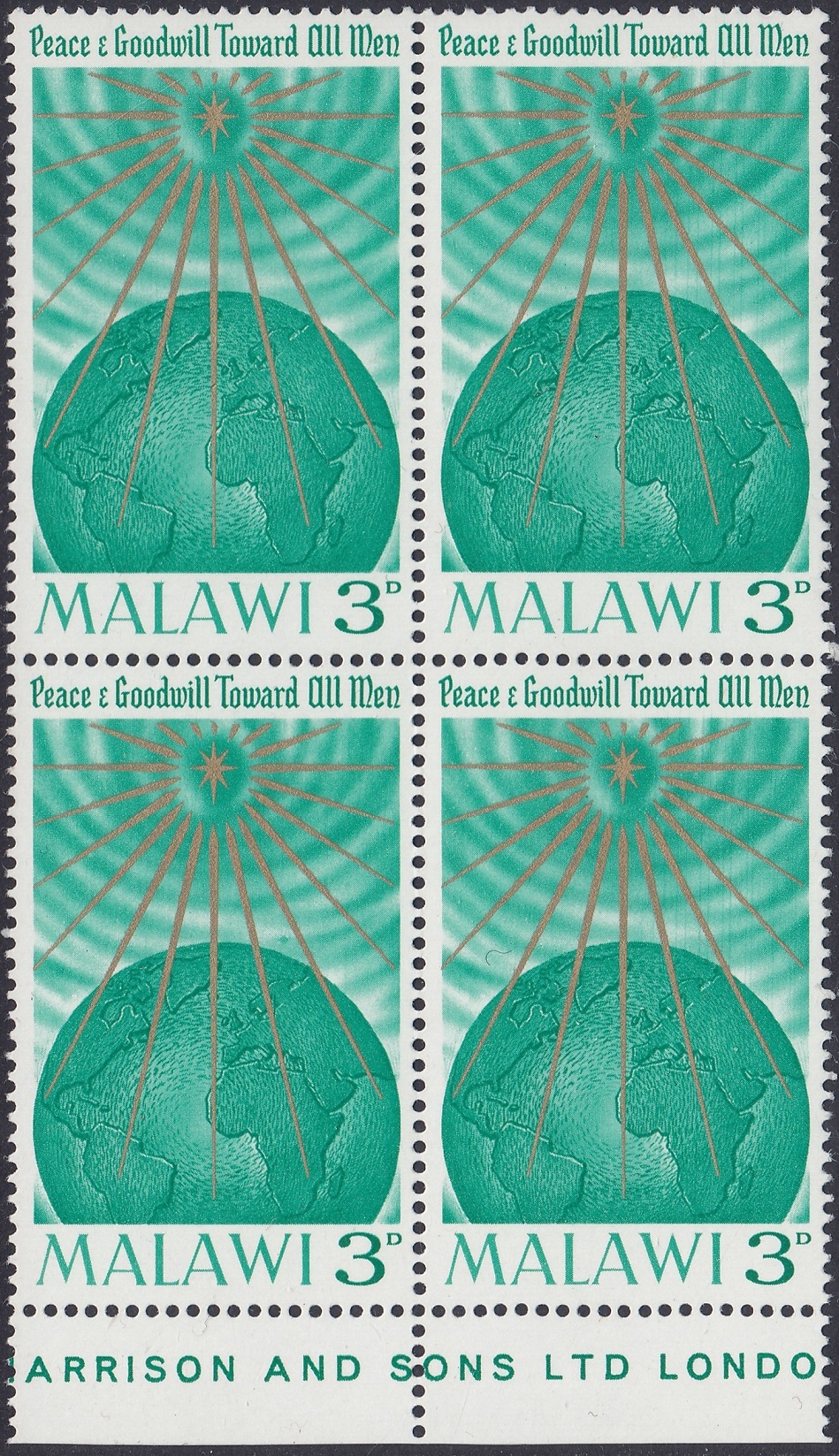 The stamp depicts the Star of Bethlehem shining on the Earth, with the message “peace and goodwill to all men.”
