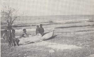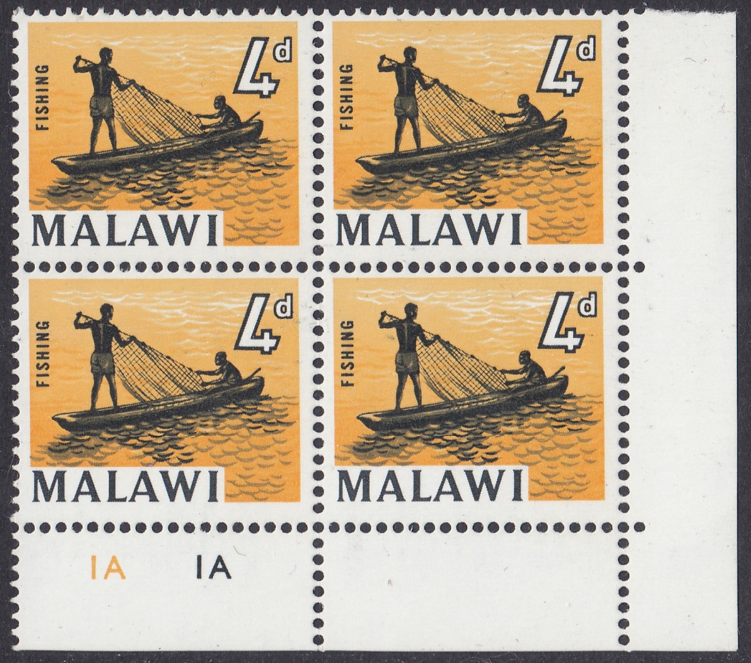 The 4d stamp was created from various pictures, both black & white and coloured, of lake fishermen and dug-outs. These were of typical scenes on Lake Malawi where traditional fishermen use hollow tree-trunk canoes and small types of seine and gill nets.