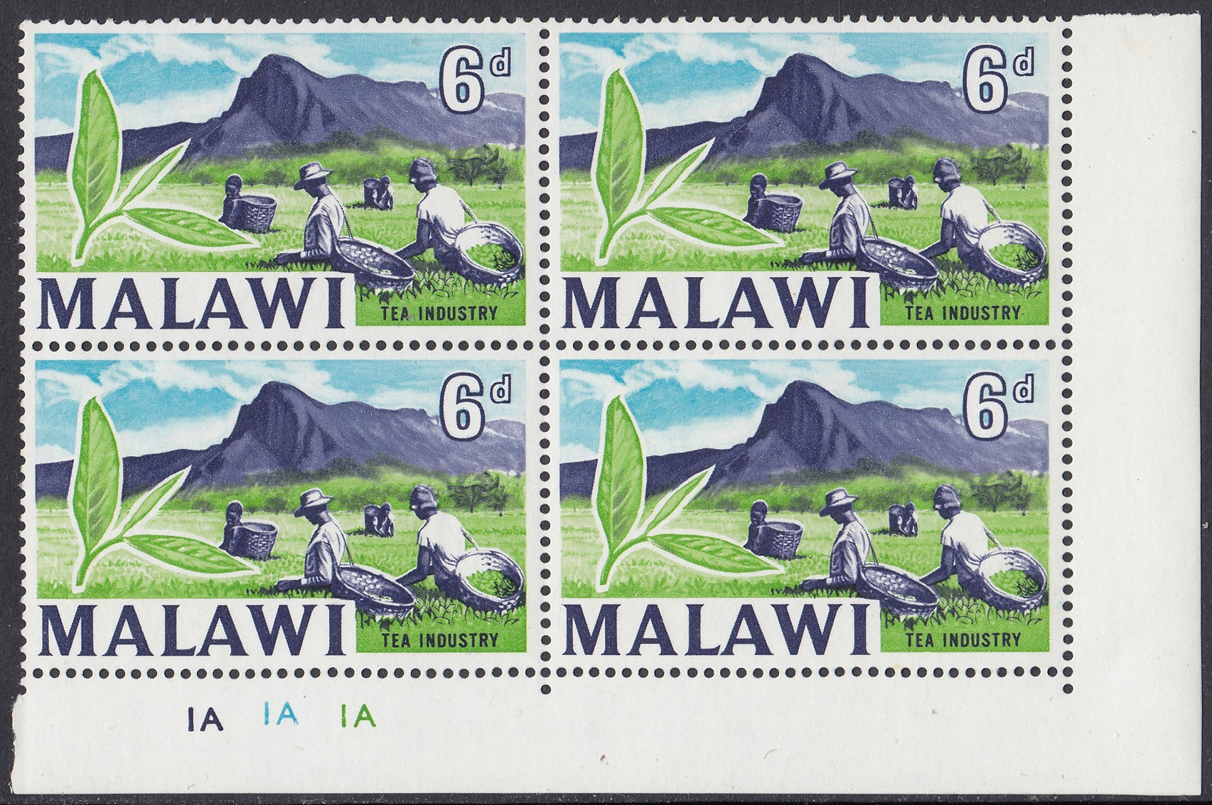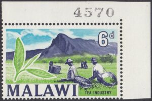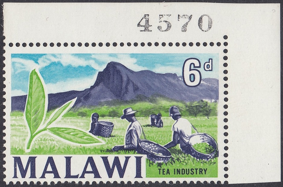 The 6d image was a composite image taken from various images of tea pickers, plantations and tea leaves of Mlanje Mountain. Originally intended to be two colours, the artwork was endorsed by Colin Cameron with the provision blue was added to the sky.